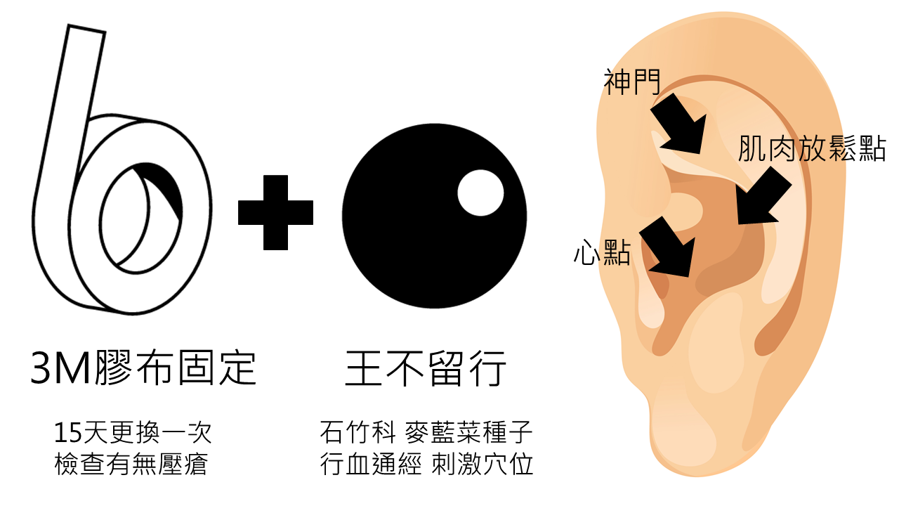 長時間耳穴刺激的方式常見的有三種,一是使用 2mm 的細針直接扎入穴位中、二是使用有磁性的鋼珠、三是如本研究中使用王不留行的種子,王不留行在中藥學理論認為具有通經活血、通暢經脈的功效,而且顆粒細小,適合需要精細定位的耳穴治療。