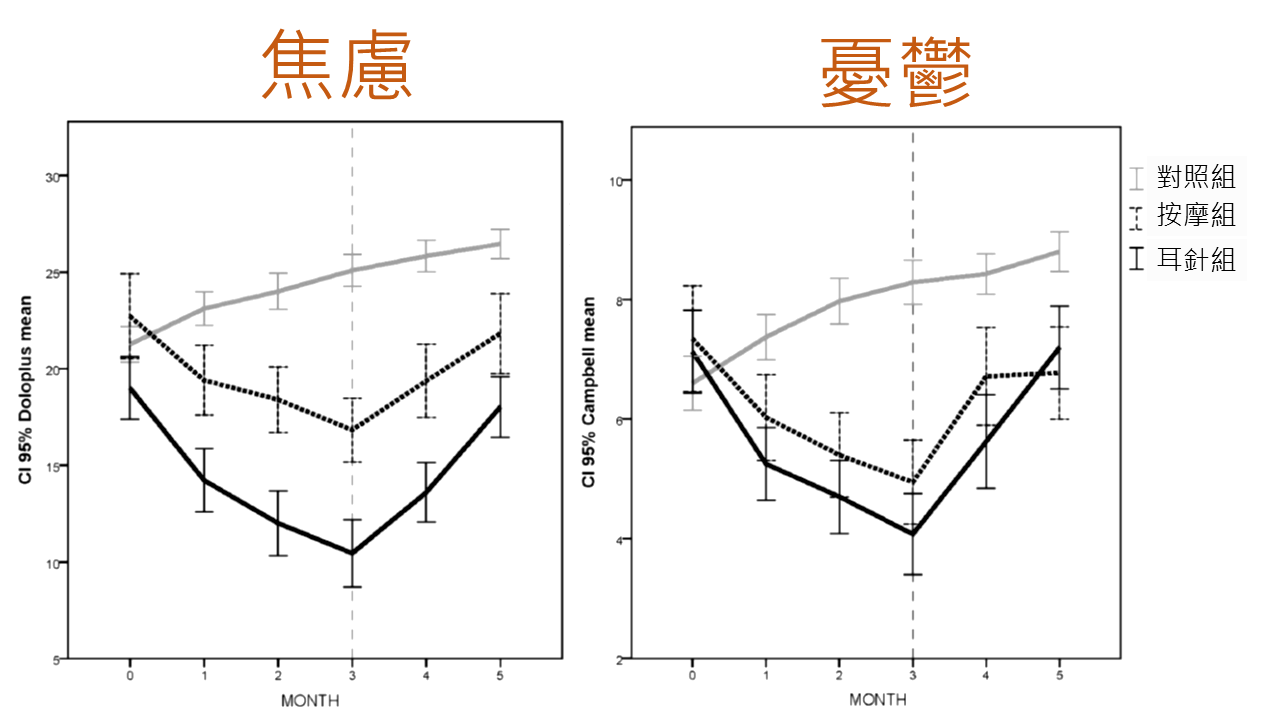 在2015年同一個研究團隊發表了後續的研究成果,發現耳針對於失智症的精神與行為症狀中,焦慮和憂鬱有明顯的改善效果,但一樣在治療停止後療效會漸漸消失。臨床上要維持療效可能需要持續的治療。