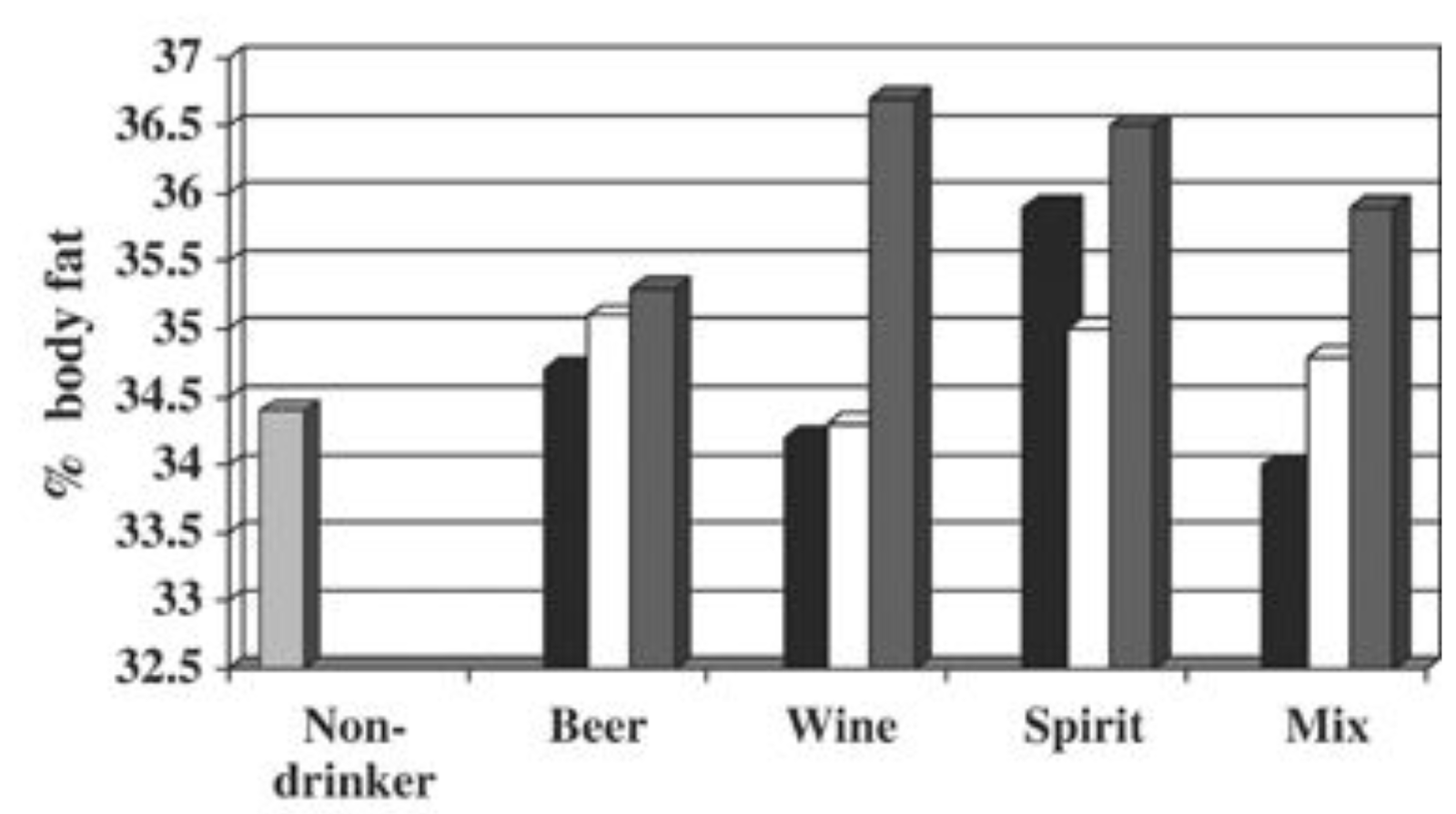 蒸餾酒造成體脂肪增加的能力不亞於啤酒,但是上一個統計圖告訴我們,它會讓體脂肪比較不容易累積在腹部,原因可能和皮質醇的濃度有關係。(如果脂肪都累積在胸部那不是很好嗎)