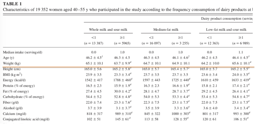 每天喝超過一份全脂/低脂/脫脂牛奶的人,體重分別是:63.7 < 64.9 < 65.6 (公斤)