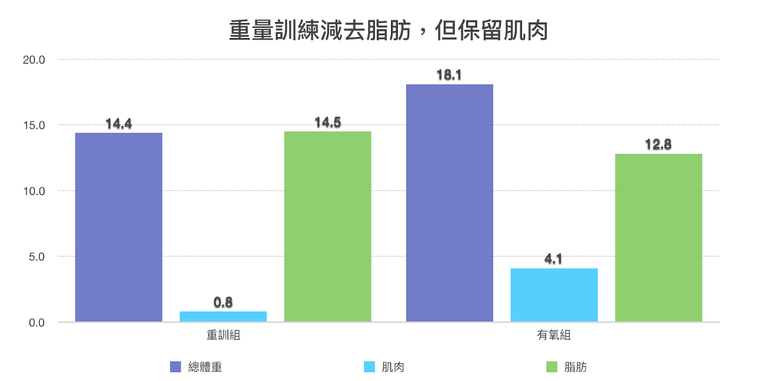 在重訓組中,總體重減少了14.4公斤,其中肌肉量少了0.8公斤,體脂肪少了14.5公斤。在有氧組中,總體重減少了 18.1公斤,但是肌肉量少了4.1公斤,體脂肪少了12.8公斤。