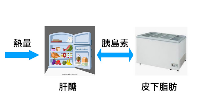 「熱量不是一進一出」其實不是一個很直觀的概念。我們用一個方式來比喻:冰箱。身體儲存熱量的方式有兩種:一個是肝醣,一個是體脂肪。肝醣是小冰箱,體脂肪則是地下室的冷凍櫃。當我們吃了很多東西,胰島素會分泌,讓熱量會以肝醣的形式儲存在小冰箱,但因為空間有限,多出來的能量就得以體脂肪的形式存放到地下的冷凍櫃去。每個人體只有一台小冰箱(肝醣),但是地下室的冷凍櫃(體脂肪)卻可以有非常多。你得把小冰箱的肝糖消耗完,身體才會去地下室搬脂肪來燒。