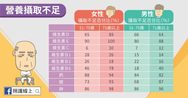 根據國民健康署的資料,營養失衡的狀況其實相當常見。六十五歲以上的民眾整體熱量的攝取上常常不足,至於各種重要營養素,像是維生素與礦物質,也是不太夠。從圖表上我們可以發現,超過七十歲的女性,有八成以上的人其維生素D、鈣、鎂、鋅攝取不足,維生素E更是普遍缺乏。