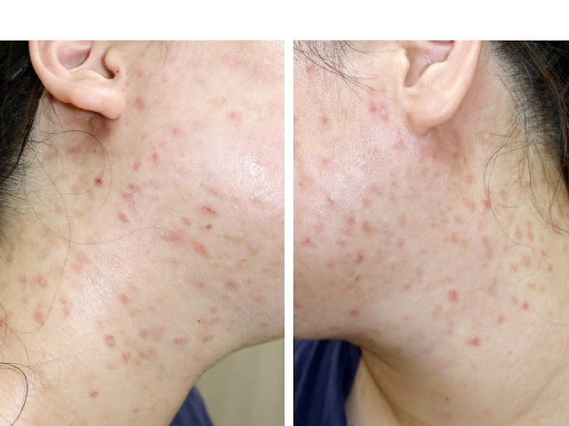除了臉頰,兩側脖子都可以看到大小不一的痘痘。雖然有些痘痘好了,只留下色素沉澱,但仍然有新的不斷冒出。