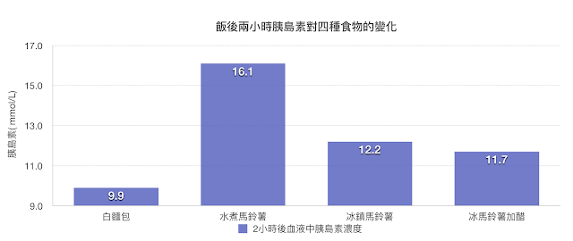 我們可以看到實驗結果:兩小時後,白麵包的升糖指數是100,水煮馬鈴薯高達168,而冰過的馬鈴薯則是125,加上醋的馬鈴薯則可以降到96。只要把馬鈴薯冰一個晚上再吃,你就比本來少了一點肥肉。冰馬鈴薯再加上醋,可以使本來的升糖指數從149.7降低到88.5,下降的幅度是41%,比麵包還要低!